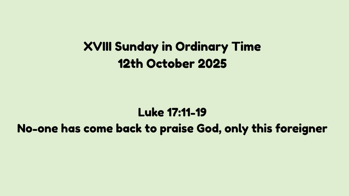 On the way to Jerusalem Jesus travelled along the border between Samaria and Galilee. As he entered one of the villages, ten lepers came to meet him. They stood some way off and called to him, ‘Jesus! Master! Take pity on us.’ When he saw them he said, ‘Go and show yourselves to the priests.’ Now as they were going away they were cleansed. Finding himself cured, one of them turned back praising God at the top of his voice and threw himself at the feet of Jesus and thanked him. The man was a Samaritan. This made Jesus say, ‘Were not all ten made clean? The other nine, where are they? It seems that no one has come back to give praise to God, except this foreigner.’ And he said to the man, ‘Stand up and go on your way. Your faith has saved you.’