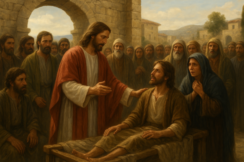 Wkrótce potem udał się do pewnego miasta, zwanego Nain; a szli z Nim Jego uczniowie i tłum wielki. Gdy zbliżył się do bramy miejskiej, właśnie wynoszono umarłego - jedynego syna matki, a ta była wdową. Towarzyszył jej spory tłum z miasta. Na jej widok Pan użalił się nad nią i rzekł do niej: «Nie płacz!» Potem przystąpił, dotknął się mar - a ci, którzy je nieśli, stanęli - i rzekł: «Młodzieńcze, tobie mówię wstań!» Zmarły usiadł i zaczął mówić; i oddał go jego matce. A wszystkich ogarnął strach; wielbili Boga i mówili: «Wielki prorok powstał wśród nas, i Bóg łaskawie nawiedził lud swój». I rozeszła się ta wieść o Nim po całej Judei i po całej okolicznej krainie.